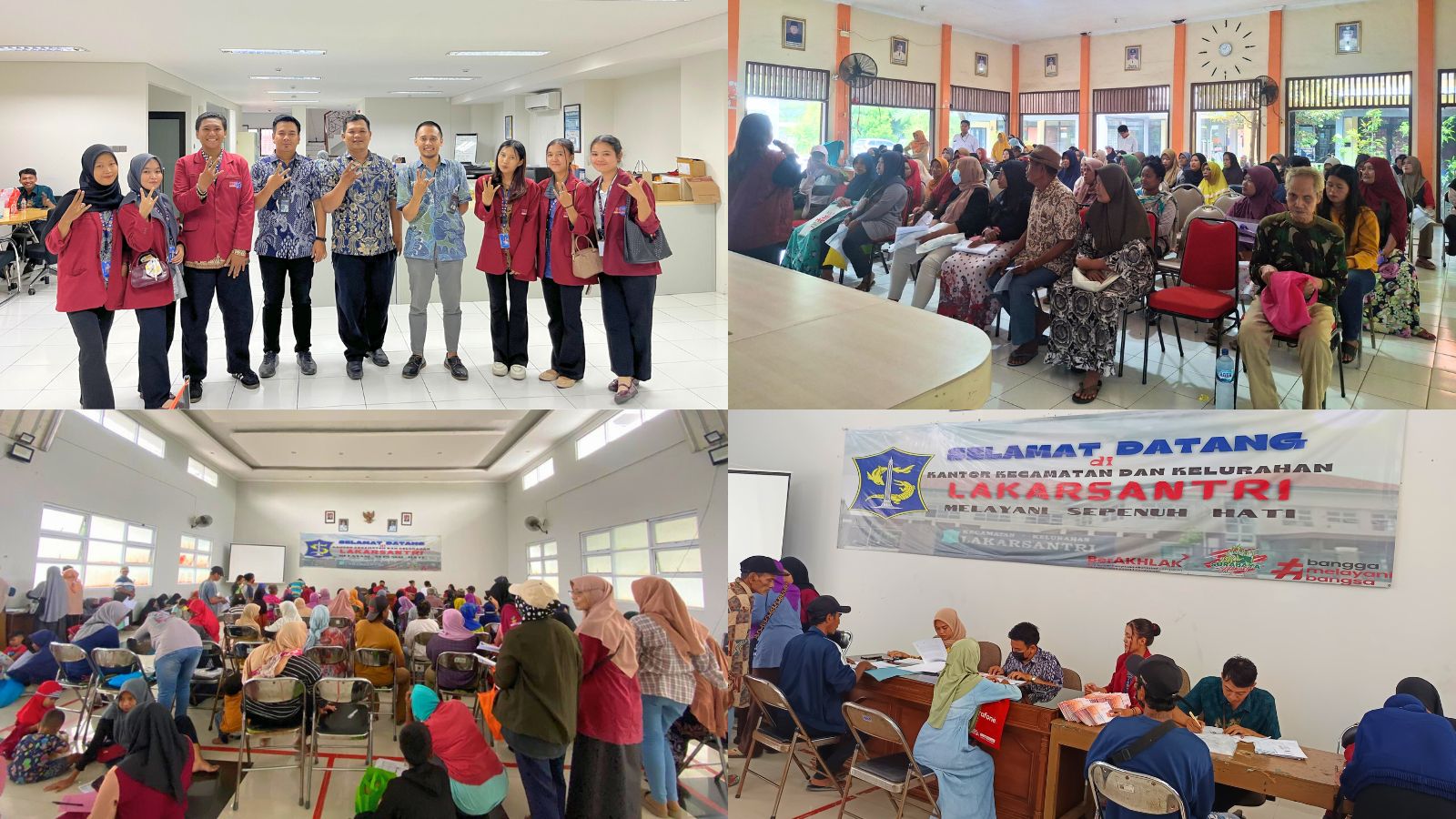 Aula Kecamatan Lakarsantri tampak dipadati oleh warga dari berbagai kelompok usia. Mereka hadir untuk mengikuti proses pendataan dan menerima bantuan sosial yang disalurkan melalui kerja sama BNI dan STIE IBMT. Suasana penuh kehangatan terlihat ketika mahasiswa membantu warga menjalani proses verifikasi dan pembagian bantuan.